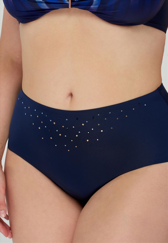 Брифы с завышенной линией талии. Спереди россыпь кристаллов.