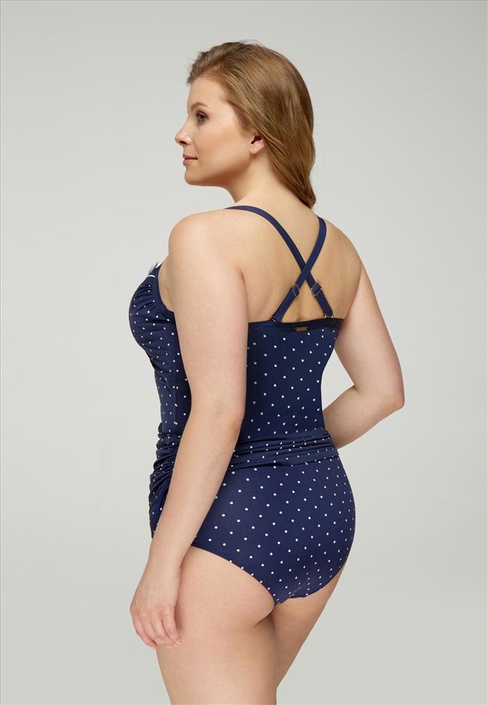 Танкини с формованной чашкой на каркасной поддержке. Регулируемые широкие бретели. Длина бока регулируется кулисками.