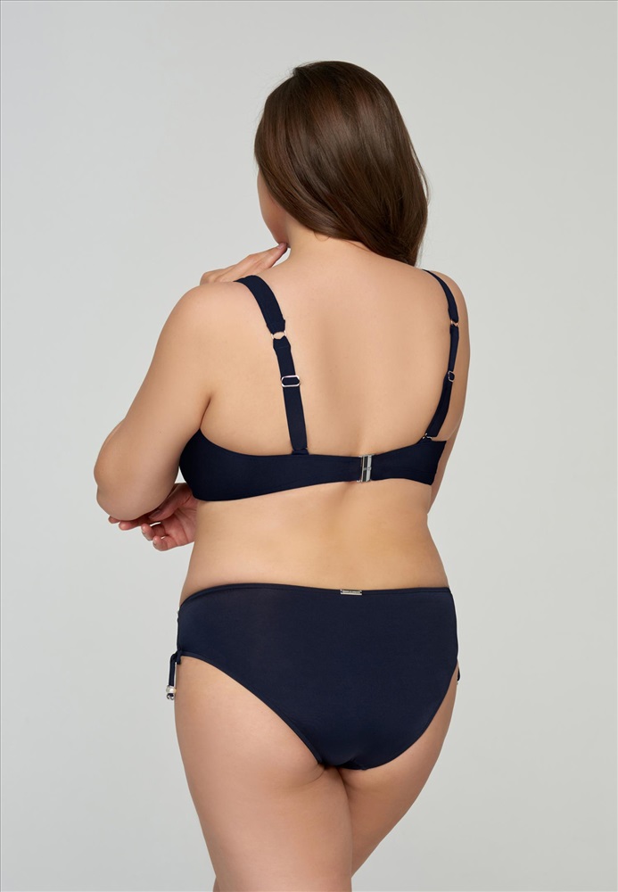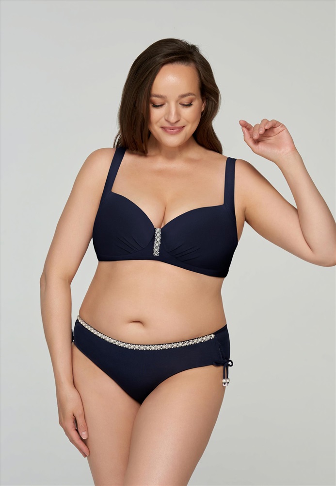 Формованная чашка со съемными корректорами «пуш-ап». Бескаркасная поддержка. Регулируемые широкие бретели. Аксессуар по центру – тесьма с перламутровыми бусинами. На спине застежка.