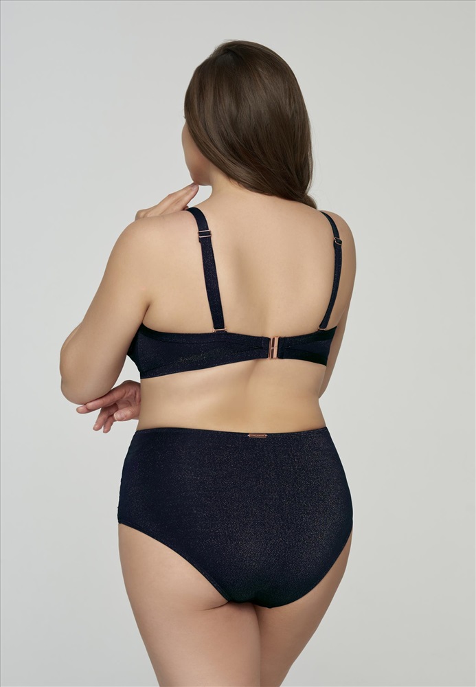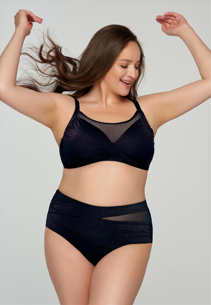 Формованная чашка на каркасной поддержке. Линия декольте выполнена из эластичной сетки. Регулируемые бретели. На спине застежка.