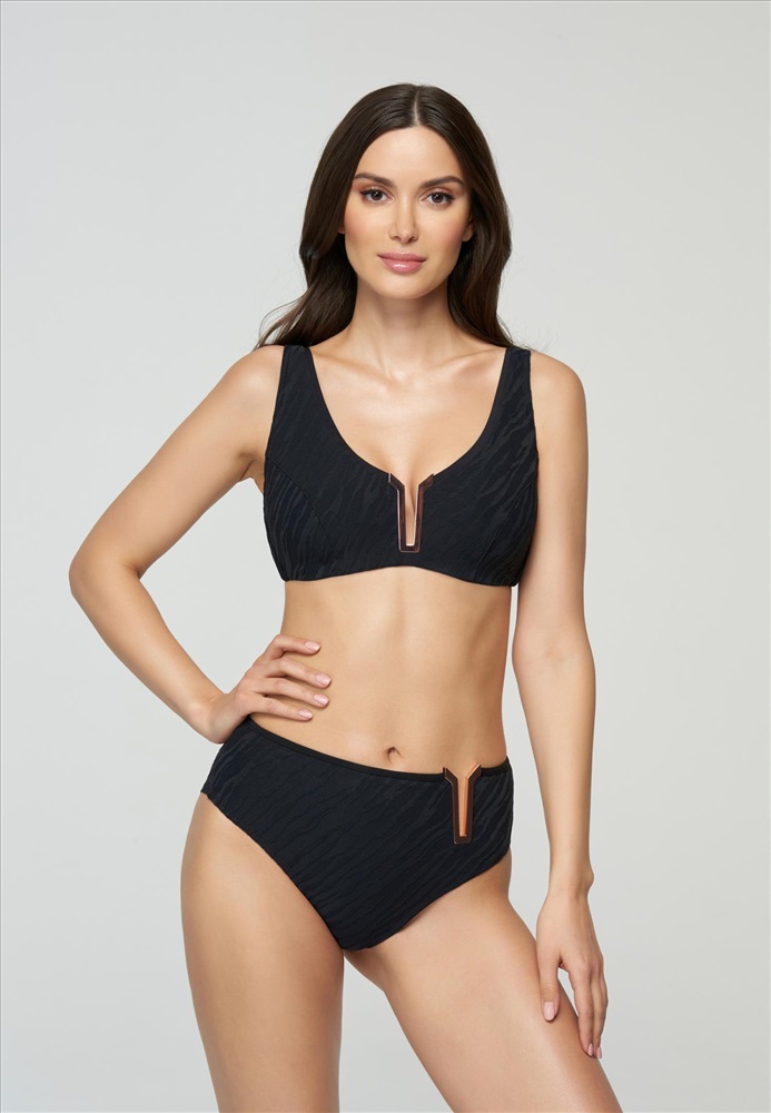 Мягкая чашка с тонкими съемными корректорами на каркасной поддержке. Линия декольте украшена металлическим аксессуаром. Регулируемые бретели. Застежка на спине.