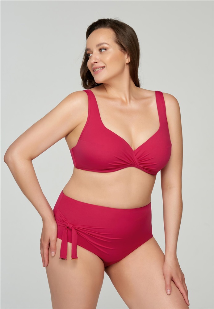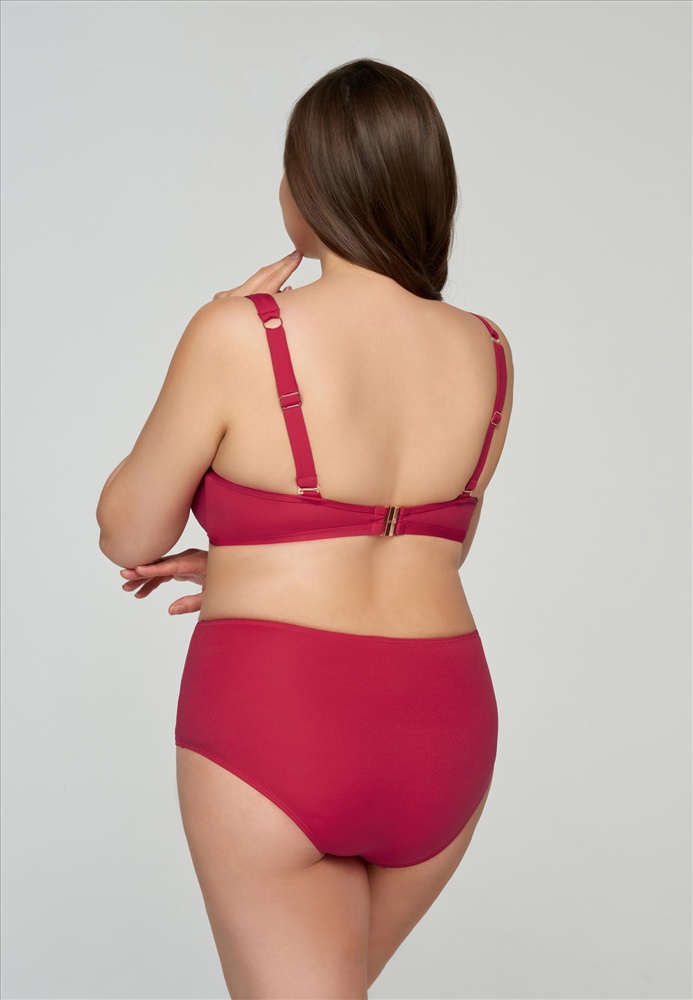 Формованная чашка на каркасной поддержке. Углубленная линия декольте. Широкие бретели с поролоновой вставкой. На спине застежка.