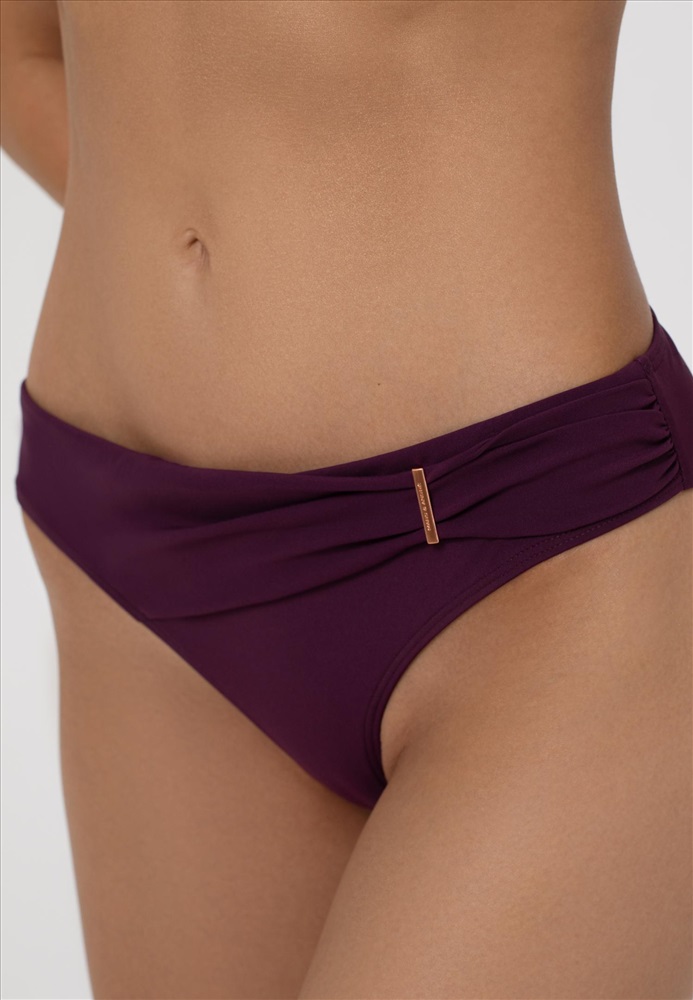 Брифы-бразилианы со средней линией талии. Асимметричная драпировка спереди с аксессуаром.