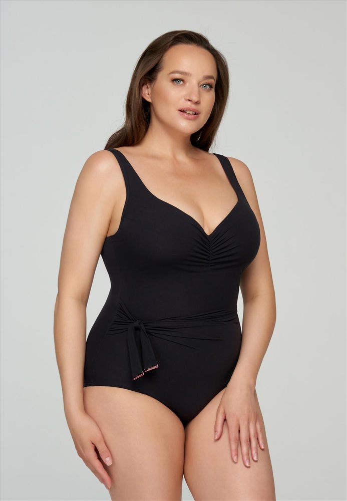 Купальник с формованной чашкой на каркасной поддержке. Углубленная линия декольте. Широкие бретели с поролоновой вставкой. Спереди драпировка и декоративный съемный бант. Бретели регулируются. Круглая спина.