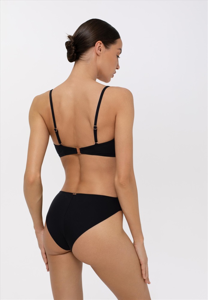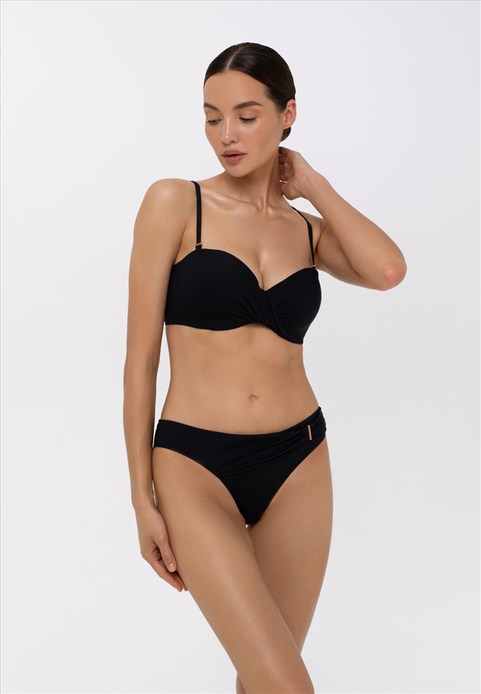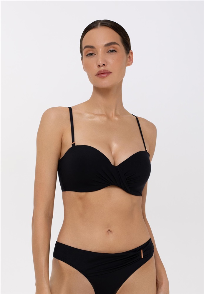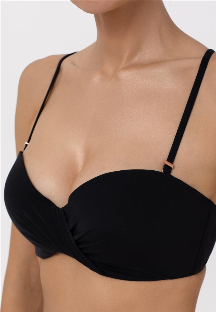Формованная чашка «бандо» на каркасной поддержке. Спереди декоративный перекрут. Съемные бретели. На спине застежка.