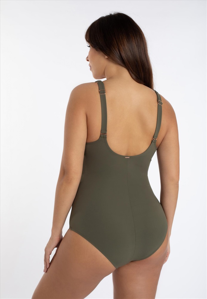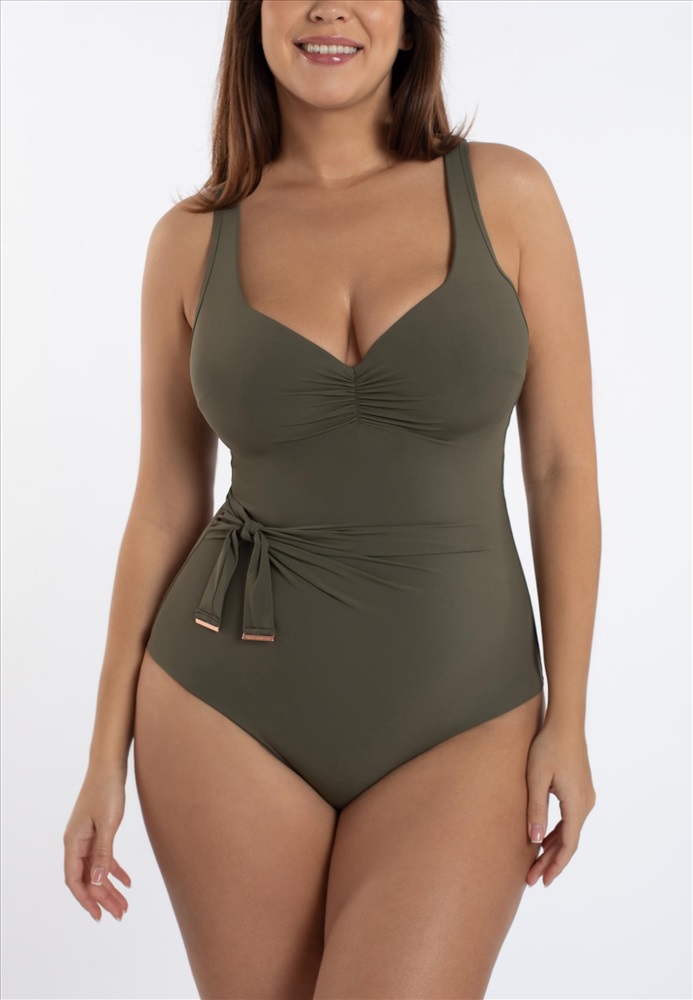 Купальник с формованной чашкой на каркасной поддержке. Углубленная линия декольте. Широкие бретелис поролоновой вставкой. Спереди драпировка и декоративный съемный бант. Бретели регулируются. Круглая спина.