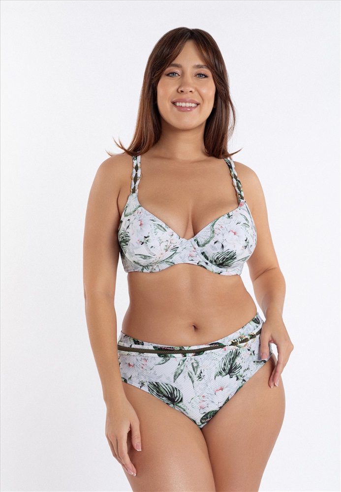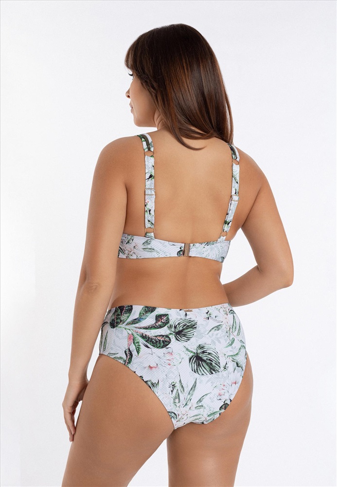 Формованная чашка на каркасной поддержке. Регулируемые бретели украшены аксессуаром. На спине застежка.