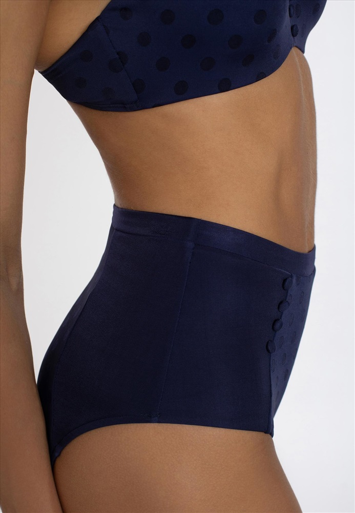 Брифы с завышенной линии талии. Боковые вставки из однотонного материала. Спереди по бокам декоративные пуговицы.