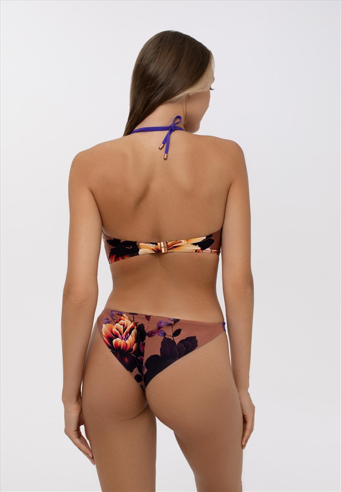 Брифы-бразилиана с заниженной линией талии. По бокам вставки из эластичной тесьмы с аксессуарами. Вертикальный шов на задней детали. Обработка задней детали в подворот с чистым краем.
