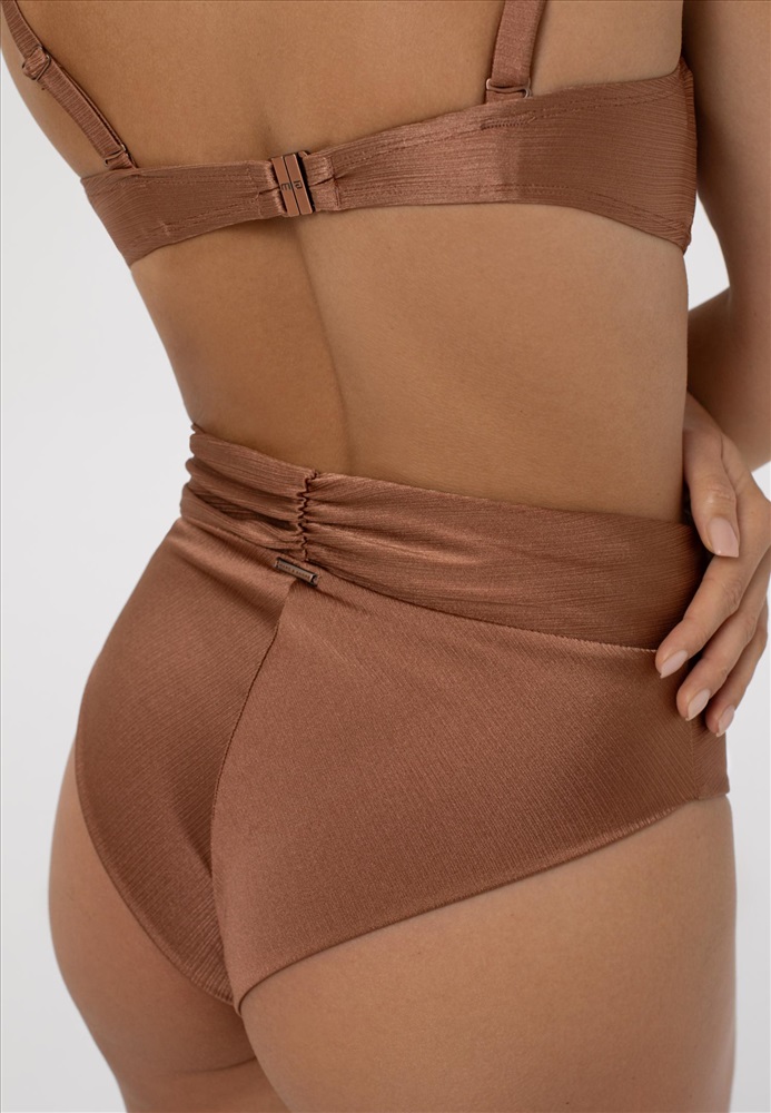 Брифы-бразилиана с завышенной линией талии. Широкий пояс с драпировкой. Завышенный вырез по линии бикини. Вертикальный шов на задней детали. Обработка задней детали в подворот с чистым краем.
