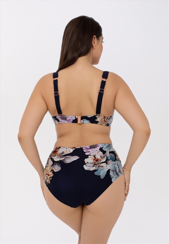 Формованная чашка на каркасной поддержке. Подойдет для обладательниц пышных форм. Углубленная линия декольте. Широкие регулируемые бретели с поролоновой вставкой. На спине застежка. На чашках «Placement» принт.