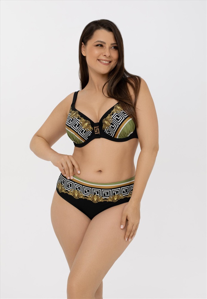 Формованная чашка на каркасной поддержке. Подойдет обладательницам пышных форм. Регулируемые бретели. По передней детали между чашек аксессуар. На спине застежка. «Placement» принт.