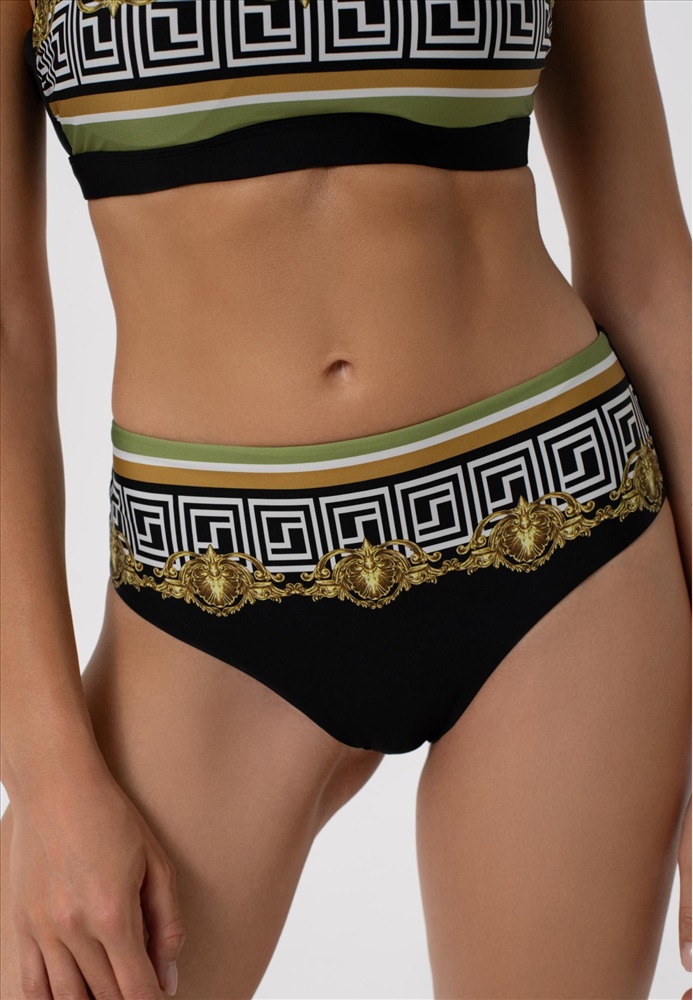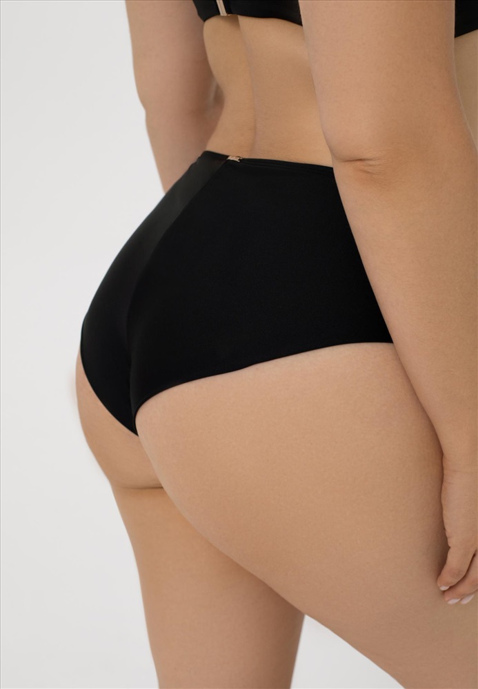 Брифы со средней линией талии. Вертикальный шов на задней детали. Обработка задней детали в подворот с чистым краем. На передней детали «Placement» принт.