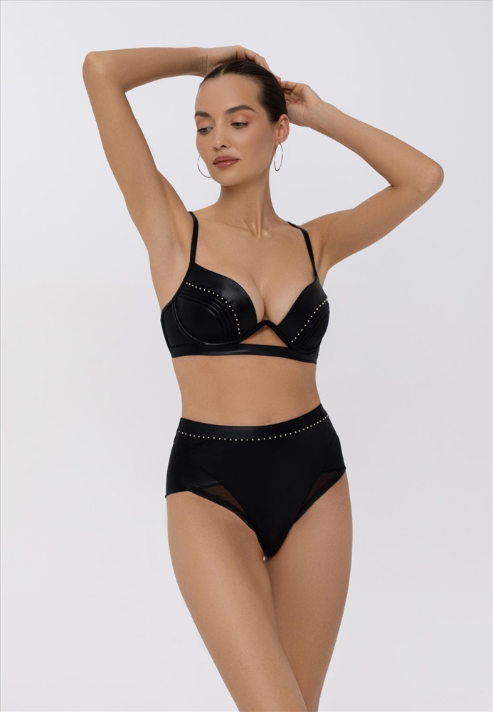 Формованная чашка со съемными корректорами «пуш-ап» на монокаркасной поддержке. Чашки спереди декорированы бусинами. Регулируемые бретели. На спине застежка.