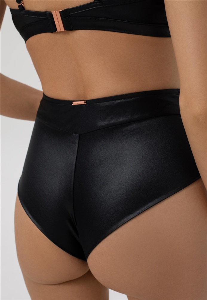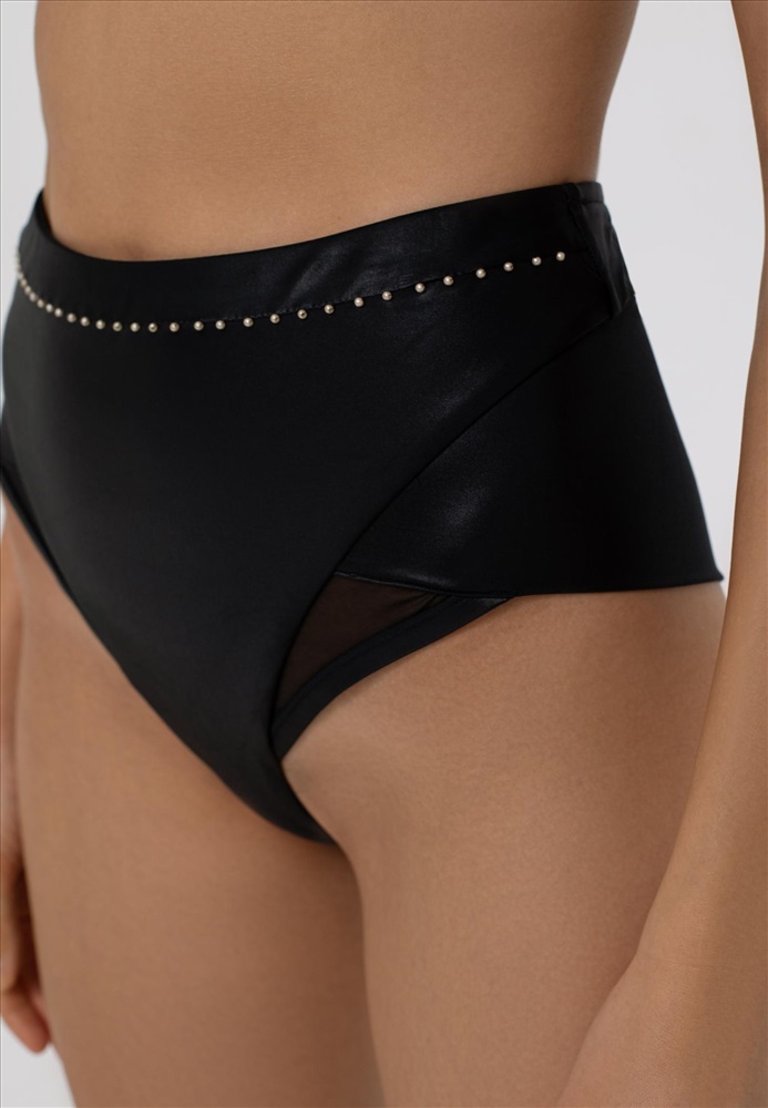 Брифы-бразилиана с завышенной линией талии. Завышенный вырез по линии бикини декорирован вставками из сетки. Пояс декорирован бусинами. Вертикальный шов на задней детали. Обработка задней детали в подворот с чистым краем.