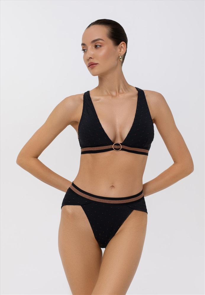 Мягкий топ с тонкими съемными корректорами. Глубокий V-образный вырез по линии декольте. По нижнему краю эластичная тесьма с аксессуаром по центру. Бретели на спине отстегиваются. На спине застежка.