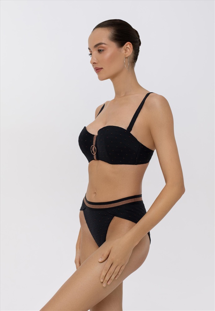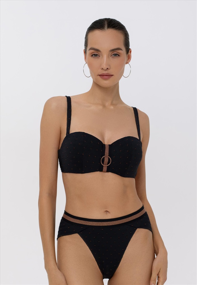 Формованная чашка «бандо» на каркасной поддержке. Спереди по центру аксессуар. Съемные регулируемые бретели. На спине застежка.