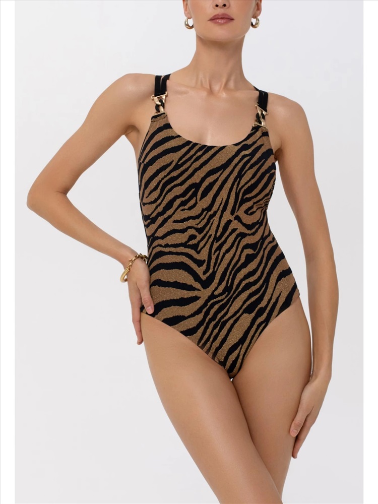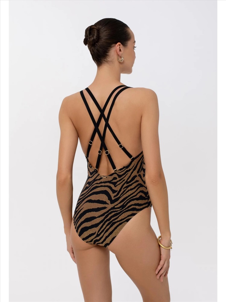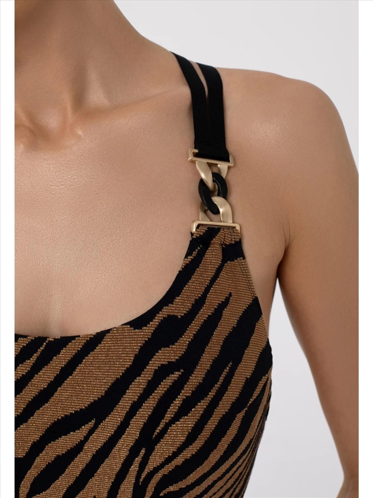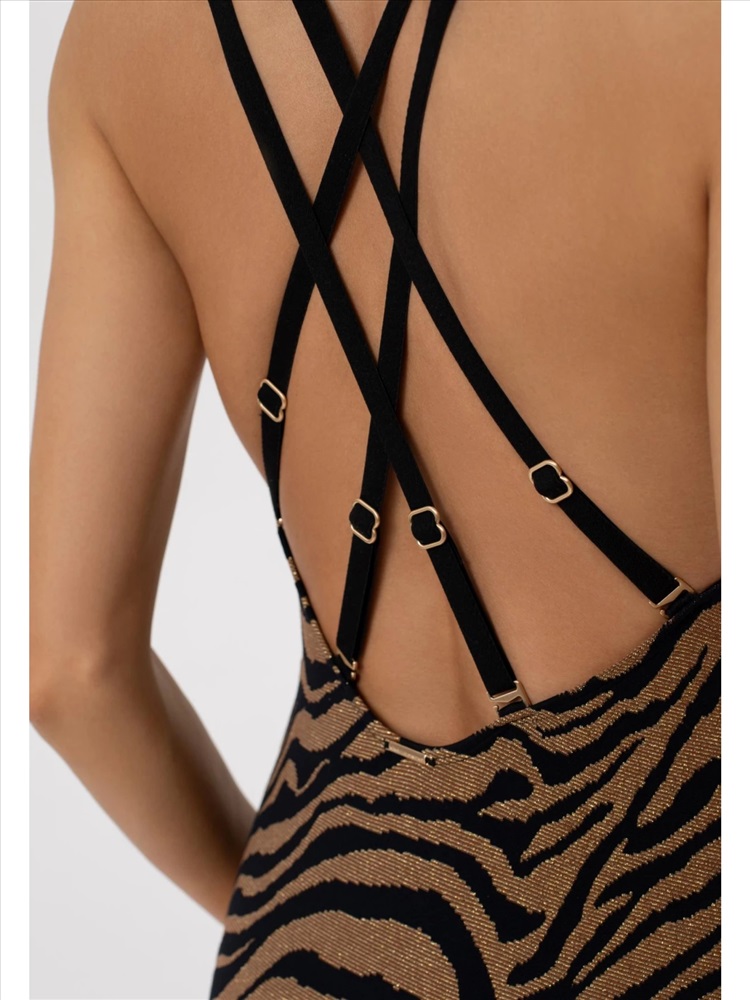 Купальник с тонкими съемными корректорами и поддерживающей резинкой под грудью. Спереди бретели-спагетти украшены аксессуарами. Вырез на спине декорирован переплетением из четырех регулируемых бретелей.