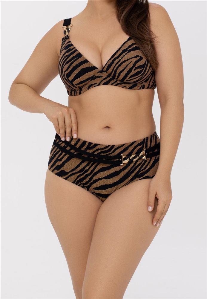 Брифы с завышенной линией талии. На передней детали декоративный пояс с аксессуаром.