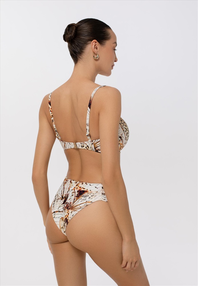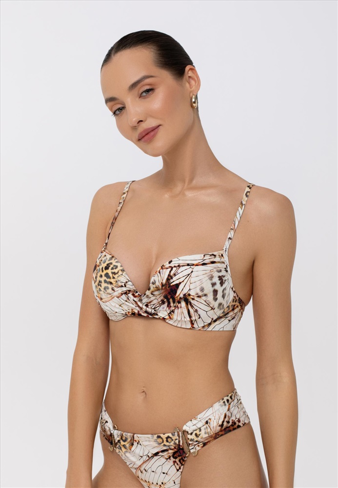 Формованная чашка на каркасной поддержке со съемными корректорами “пуш-ап”. Спереди декоративный перекрут. Регулируемые бретели. На спине застежка