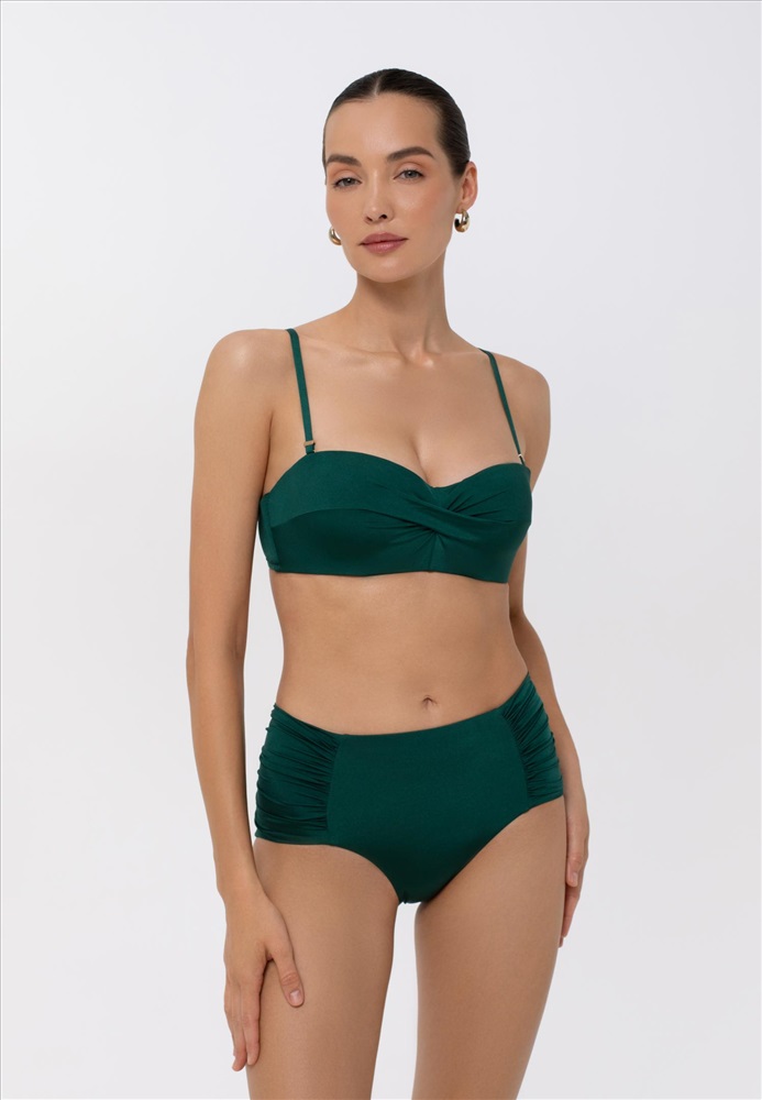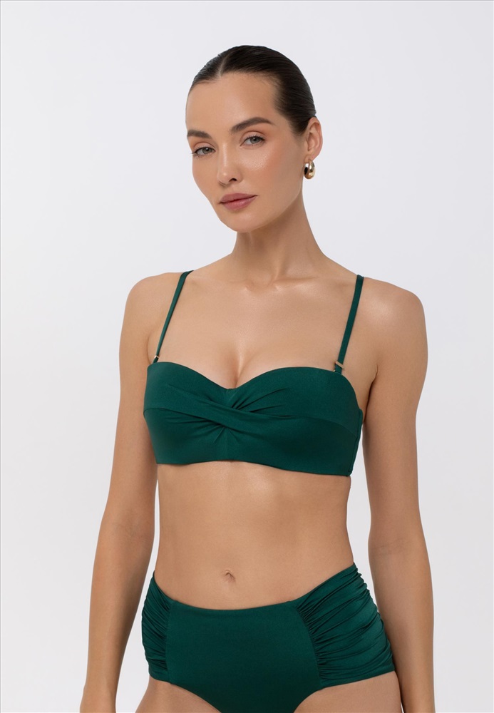 Формованная чашка «бандо» со съемным корректором «пуш-ап» на каркасной поддержке. Спереди декоративный перекрут. Регулируемые съемные бретели.