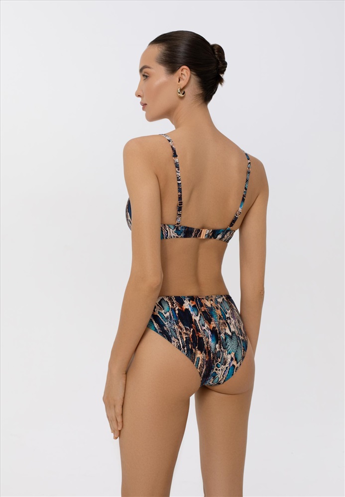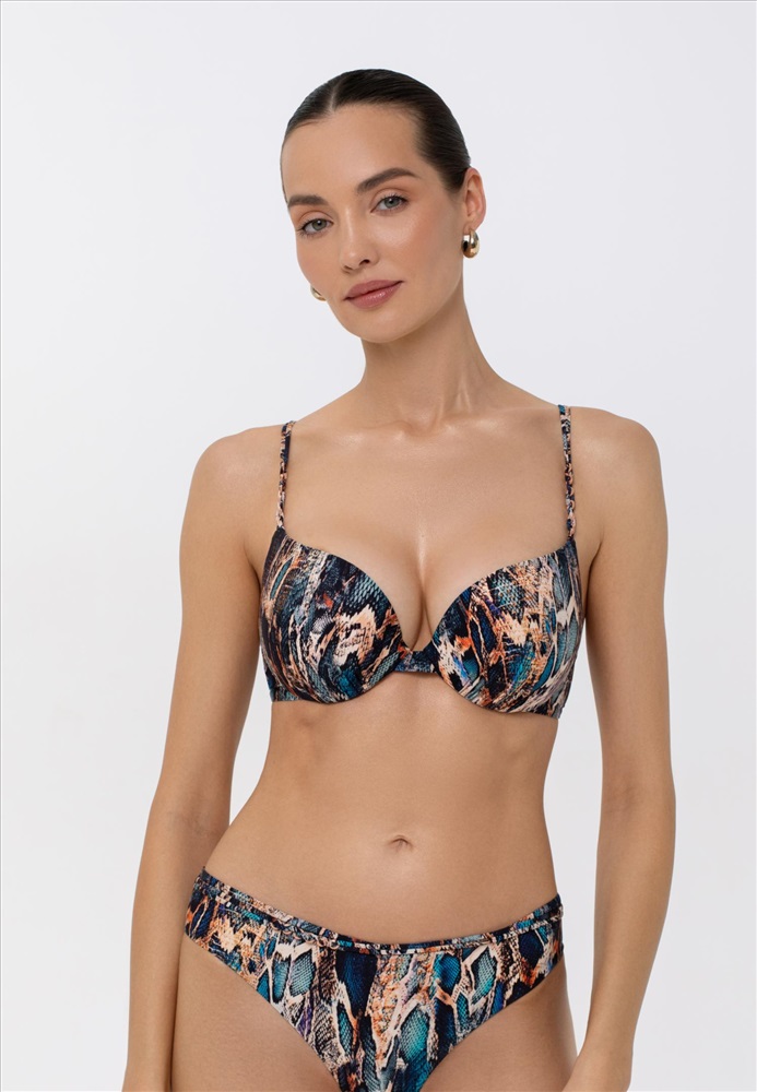 Формованная чашка со съемными корректорами “пуш-ап” на каркасной поддержке. На спине застежка. Регулируемые бретели декорированы аксессуарами