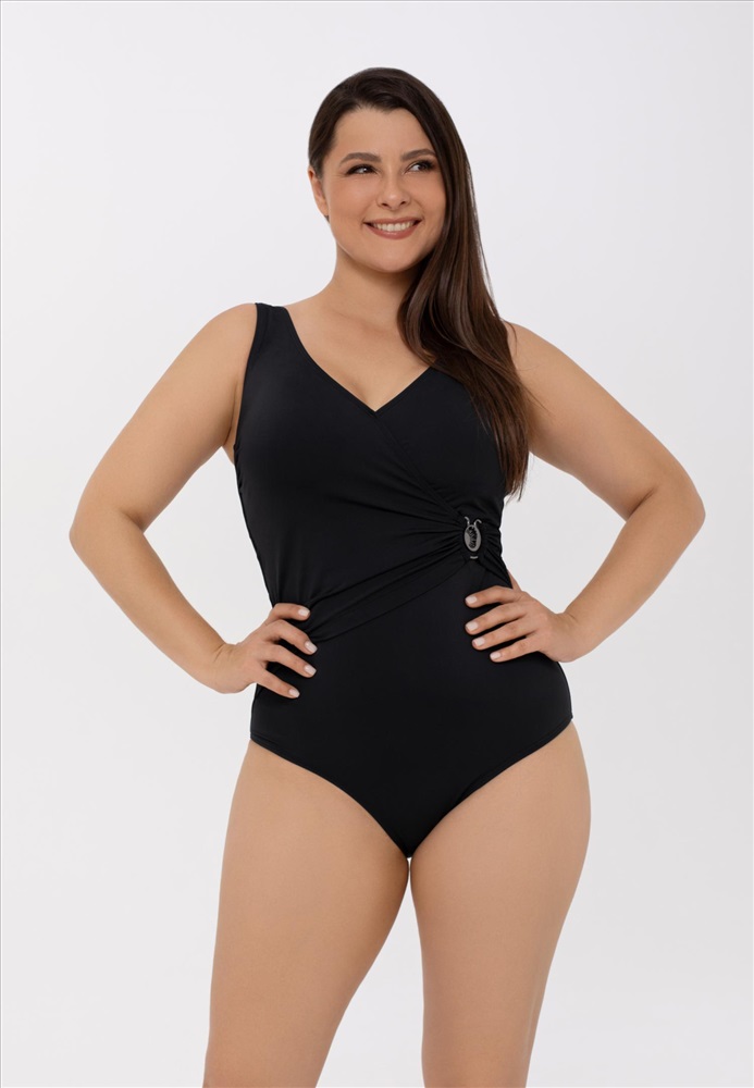 Купальник с вшитыми корректорами SPACER и поддерживающей резинкой под грудью. Подойдет для обладательниц пышных форм. Асимметричный крой и драпировка с аксессуаром на передней детали визуально корректируют фигуру.