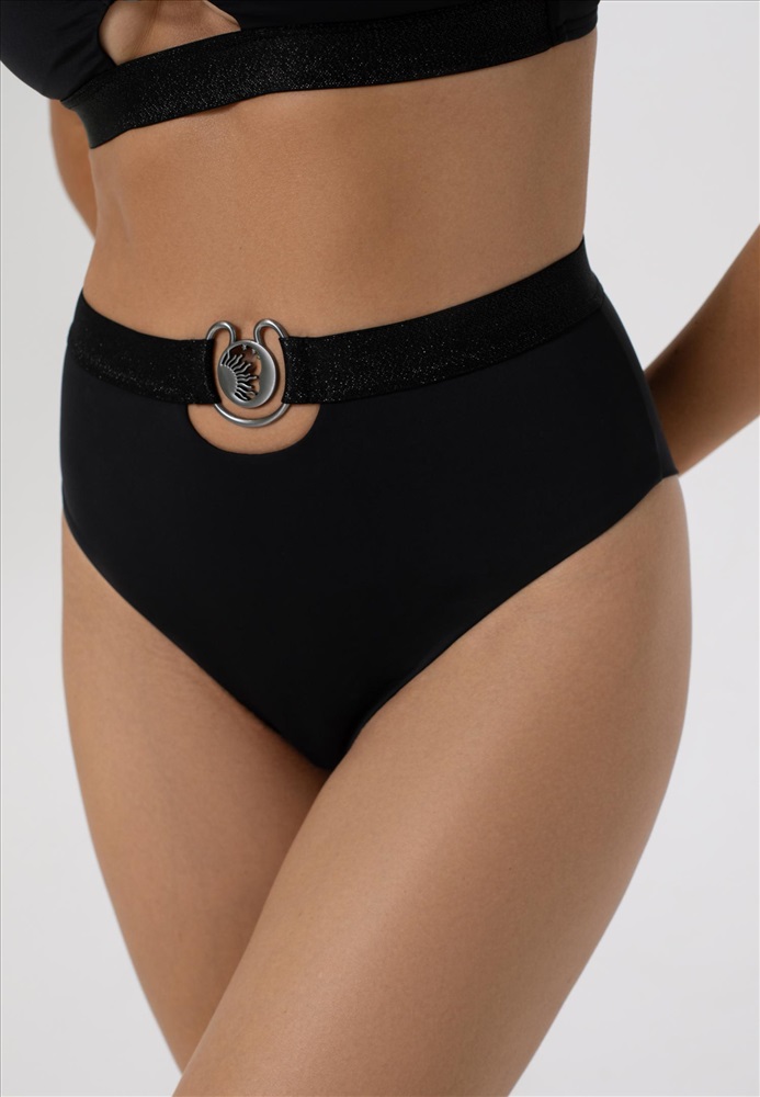 Брифы-бразилиана с завышенной линией талии. Широкий пояс из эластичной тесьмы с аксессуаром на передней детали. Завышенный вырез по линии бикини. Обработка задней детали в подворот с чистым краем.