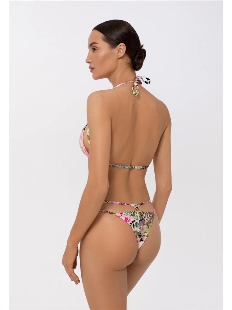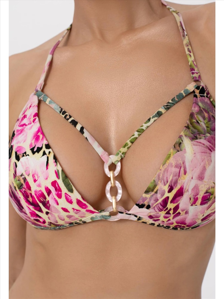 Формованная треугольная чашка со съемными корректорами «пуш-ап». Бретели регулируются по длине. По центру декоративная тесьма украшена аксессуаром. На спине застежка – крючок.