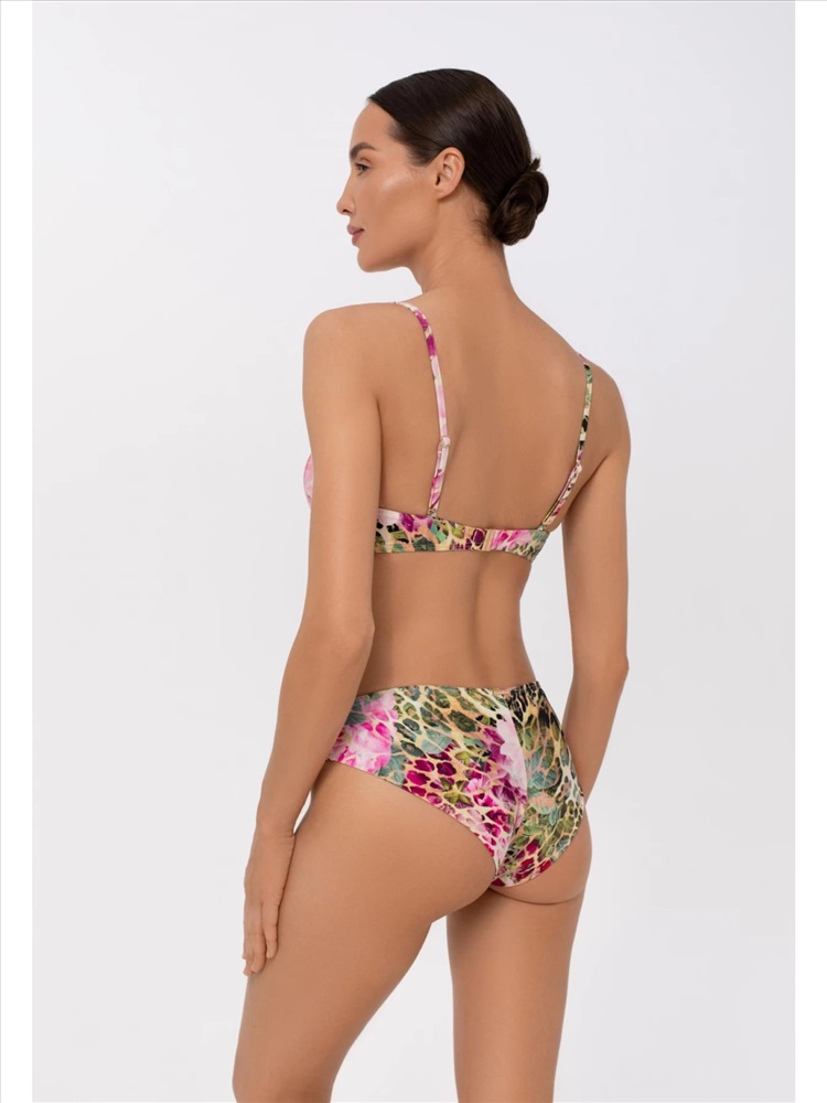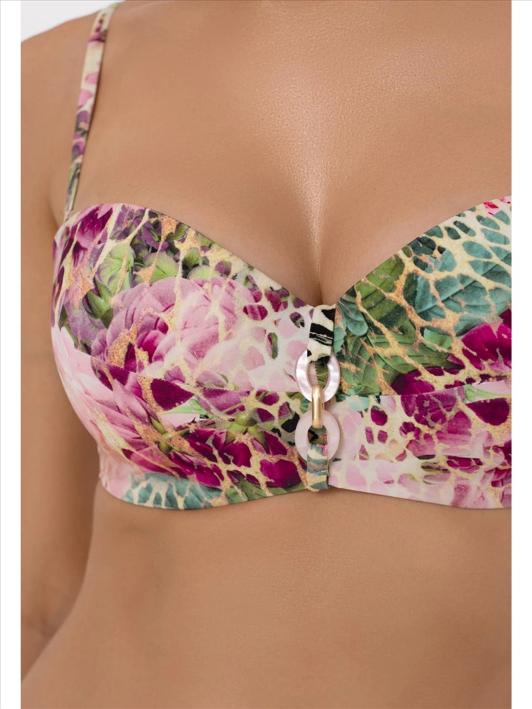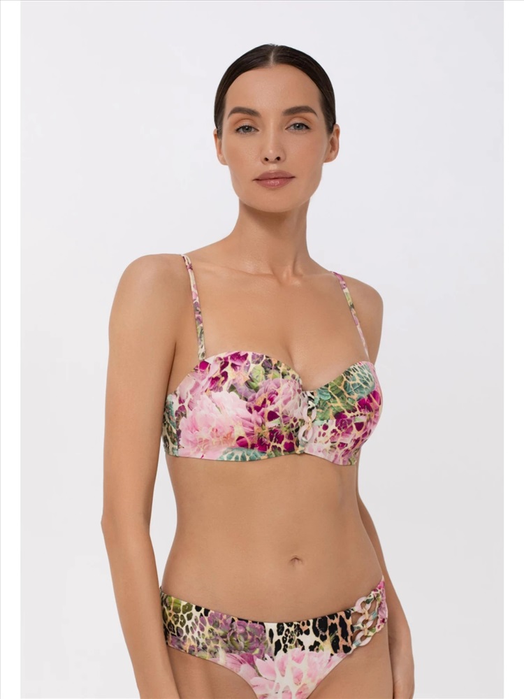 Формованная чашка “бандо” на каркасной поддержке. Съемные регулируемые бретели. На спине застежка.