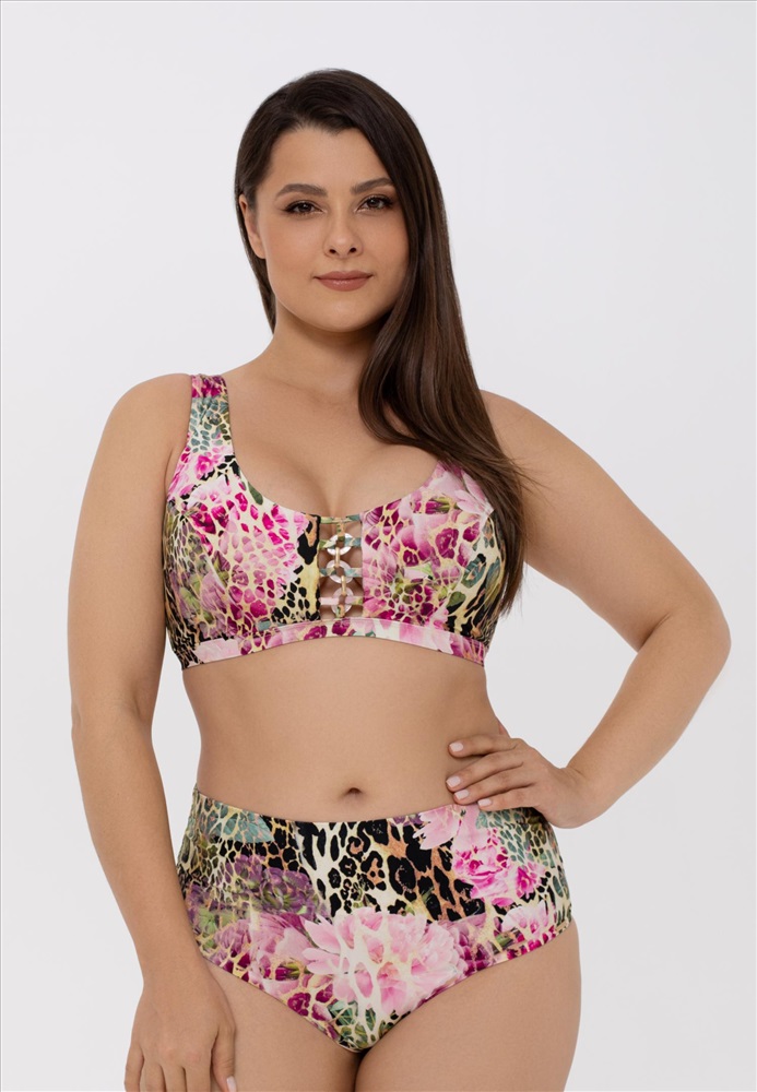 Мягкая чашка на каркасной поддержке. Подойдет обладательницам пышных форм. На передней детали декоративная вставка из воздушных петель с кольцами. Регулируемые бретели. На спине застежка.