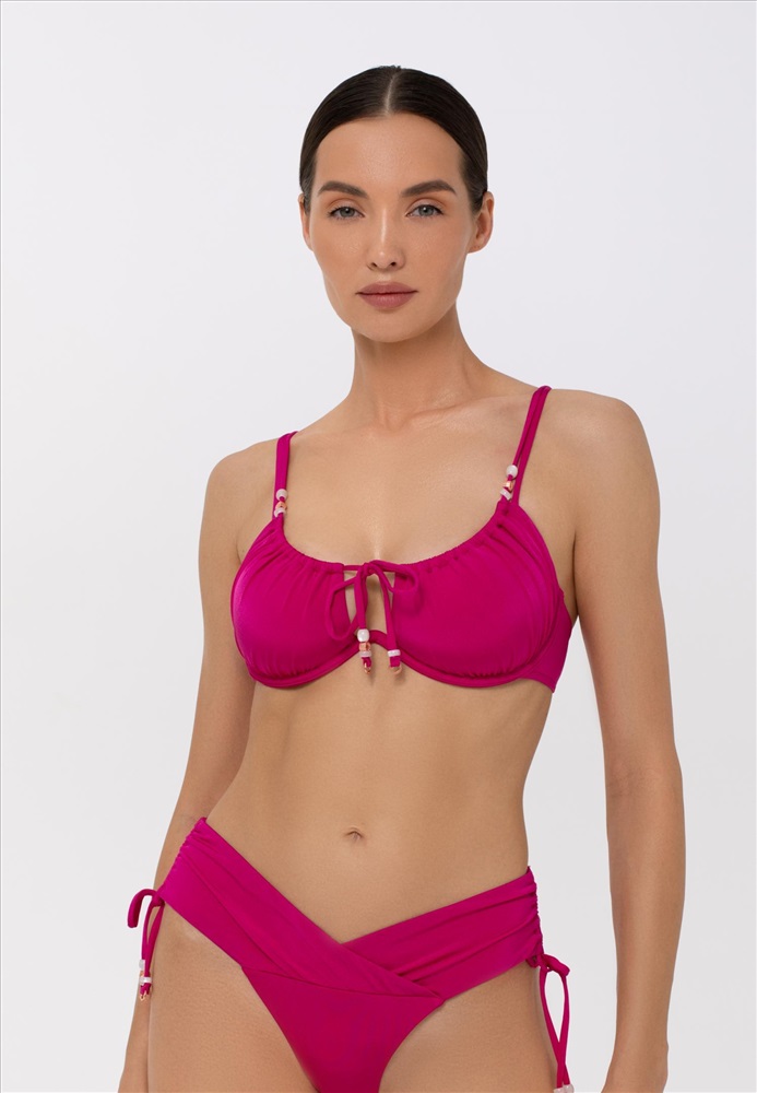 Мягкая чашка с тонкими съемными корректорами на монокаркасной поддержке. По линии декольте регулируемая кулиска. Регулируемые бретели-спагетти украшены декоративными бусинами. Застежка на спине.