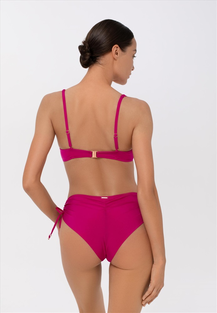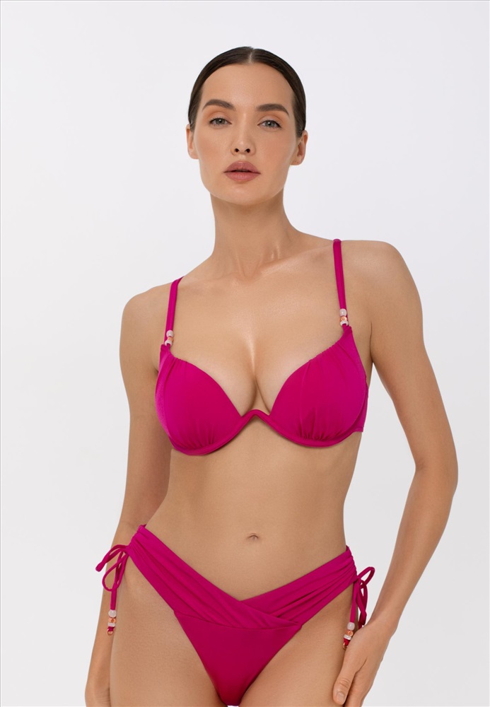 Формованная чашка со съемными корректорами «пуш-ап» на монокаркасной поддержке. Регулируемые бретели-спагетти украшены декоративными бусинами. Застежка на спине.