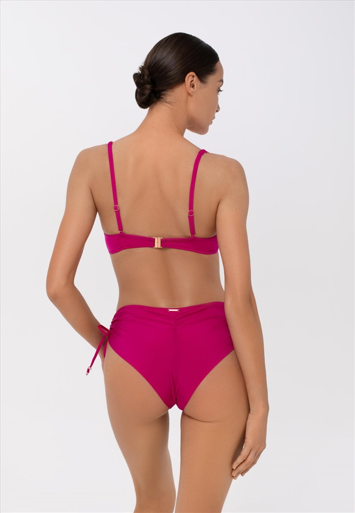 Брифы-бразилиана со средней линией талии. Асимметричный крой по передней детали. Высота бока регулируется кулисками. Обработка задней детали в подворот с чистым краем.