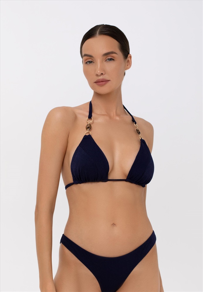 Мягкая треугольная чашка с тонкими съемными корректорами. Завязки вокруг шеи украшены аксессуарами. Застежка – крючок.