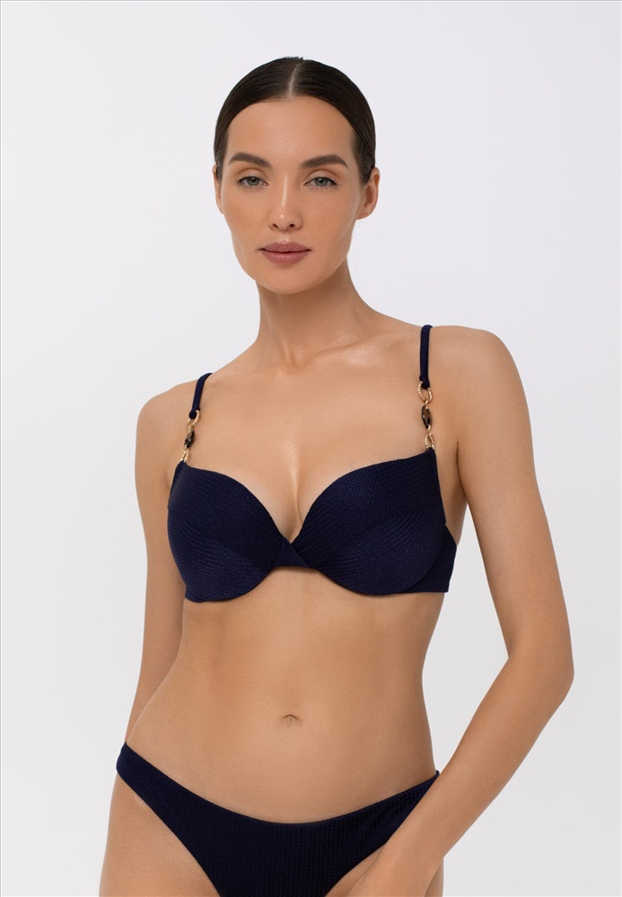 Формованная чашка со съемными корректорами “пуш-ап” на каркасной поддержке. На спине застежка. Регулируемые бретели украшены аксессуарами.