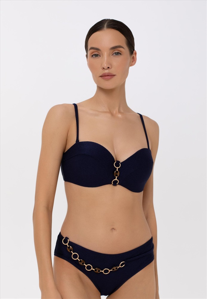 Формованная чашка «бандо» на каркасной поддержке. По центру аксессуар. Съемные регулируемые бретели. На спине застежка.