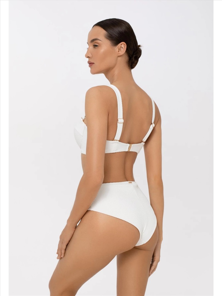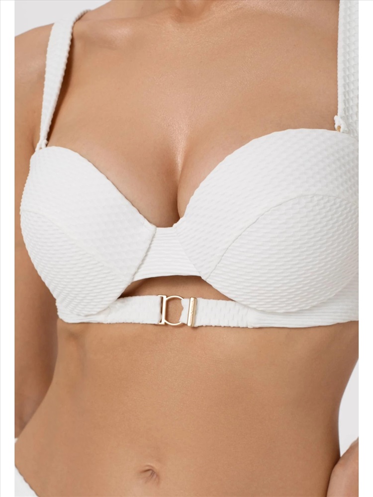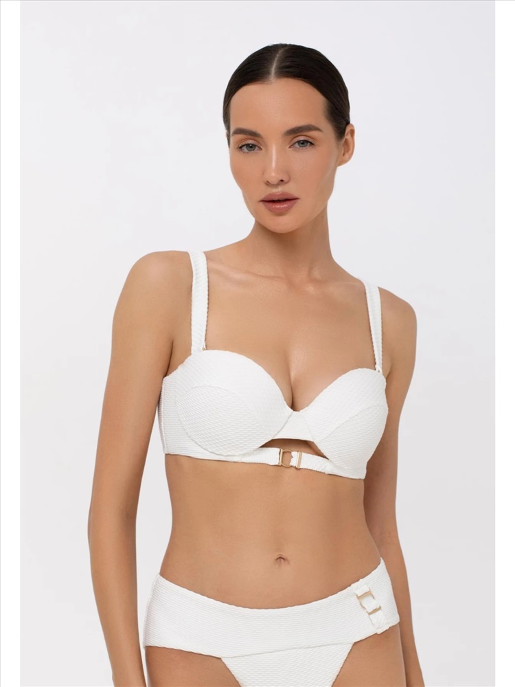 Формованная чашка «бандо» на каркасной поддержке. Между чашками декоративный вырез и резинка с аксессуаром. Съемные широкие бретели. Дополнительный комплект классических бретелей. На спине застежка.