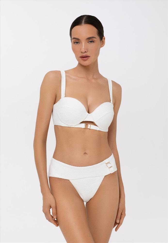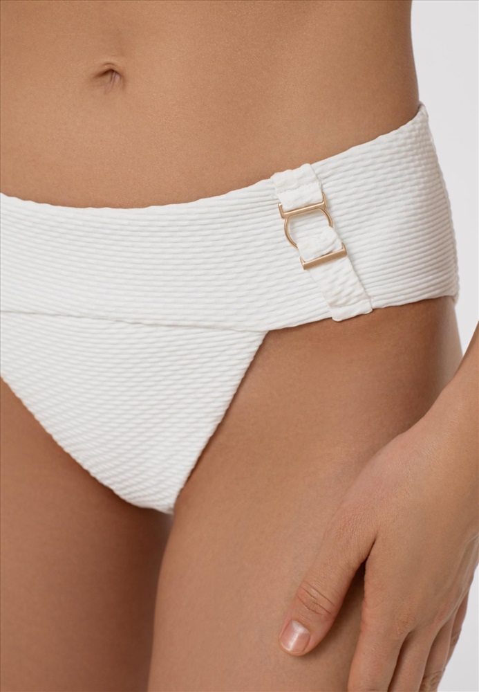 Брифы-бразилиана со средней линией талии. Декоративный широкий пояс на передней детали с аксессуаром. Вертикальный шов на задней детали. Обработка задней детали в подворот с чистым краем.