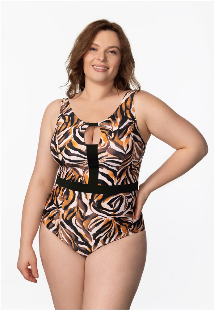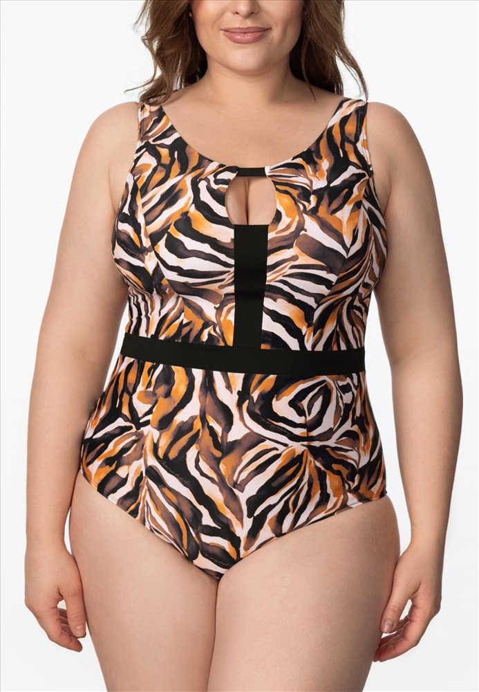 Купальник со вшитыми «Spacer» корректорами и поддерживающей резинкой под грудью. Закрытая линия декольте. Декоративные контрастнае вставки по центру и по линии талии. Открытая спина. Две эластичные контрастные ленты фиксируют вырез на спине.