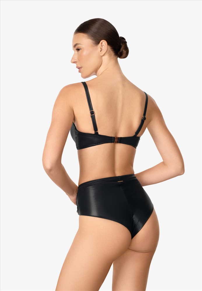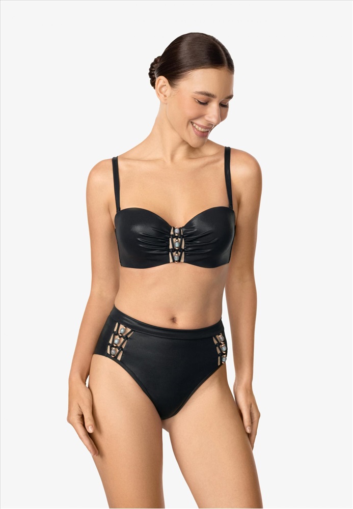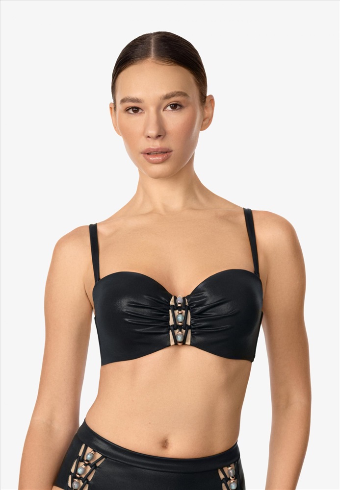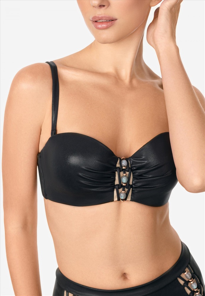 Формованная чашка «бандо» на каркасной поддержке. По центру декоративная вставка телесного цвета со шнурами из основной ткани с аксессуарами. Съемные бретели. На спине застежка.