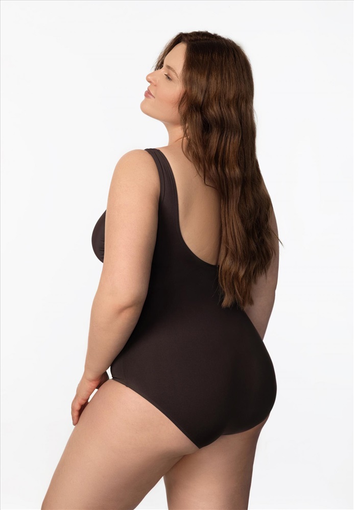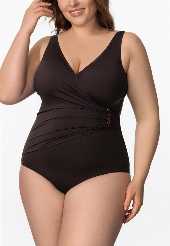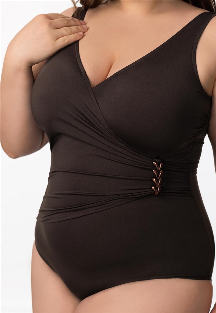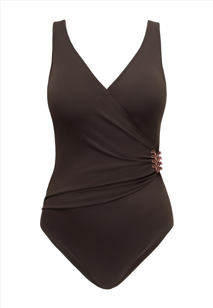 Купальник с тонкими вшитыми корректорами и поддерживающей резинкой под грудью. Асимметричный крой и драпировка с аксессуаром на передней детали визуально корректируют фигуру. С изнанки — корректирующий слой специальной подкладки (powermesh).
