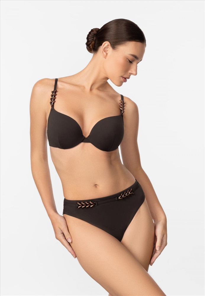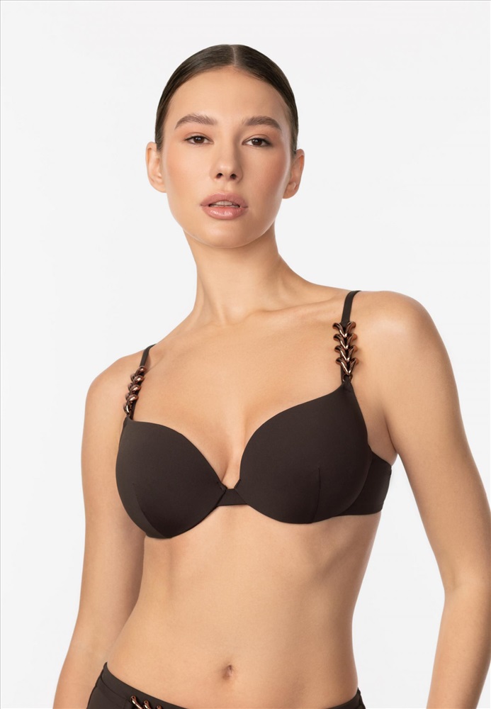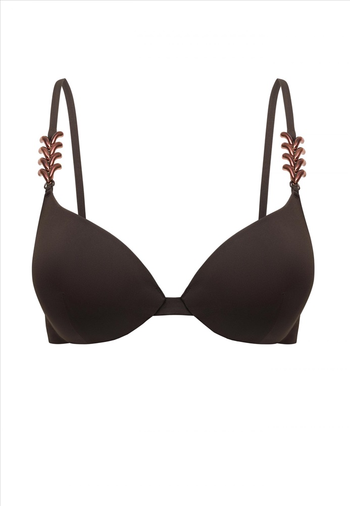 Формованная чашка на каркасной поддержке со съемными корректорами «пуш-ап». На спине застежка. Регулируемые бретели украшены аксессуарами.