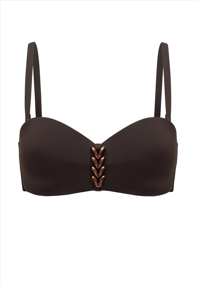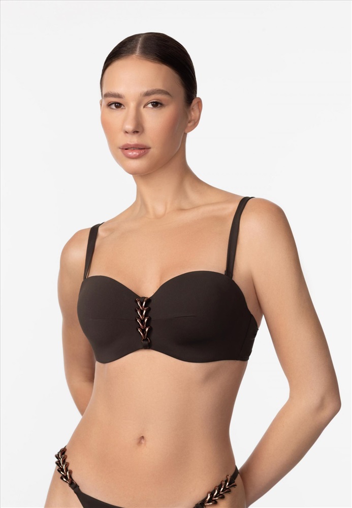 Формованная чашка «бандо» на каркасной поддержке. По центру аксессуар. На спине застежка.