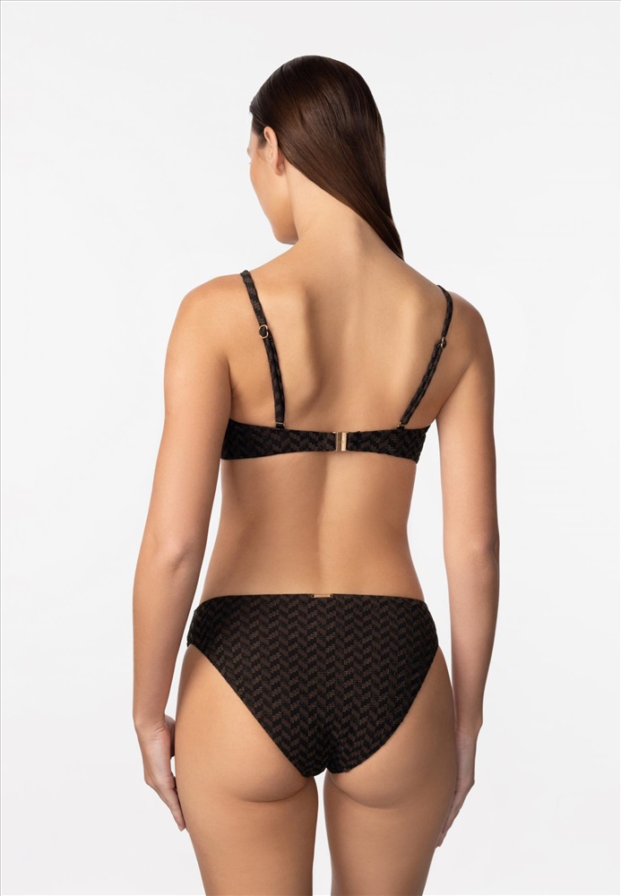 Мягкая треугольная чашка с тонкими съемными корректорами. Между чашек аксессуар. Регулируемые бретели фиксируются на спине. На спине застежка.