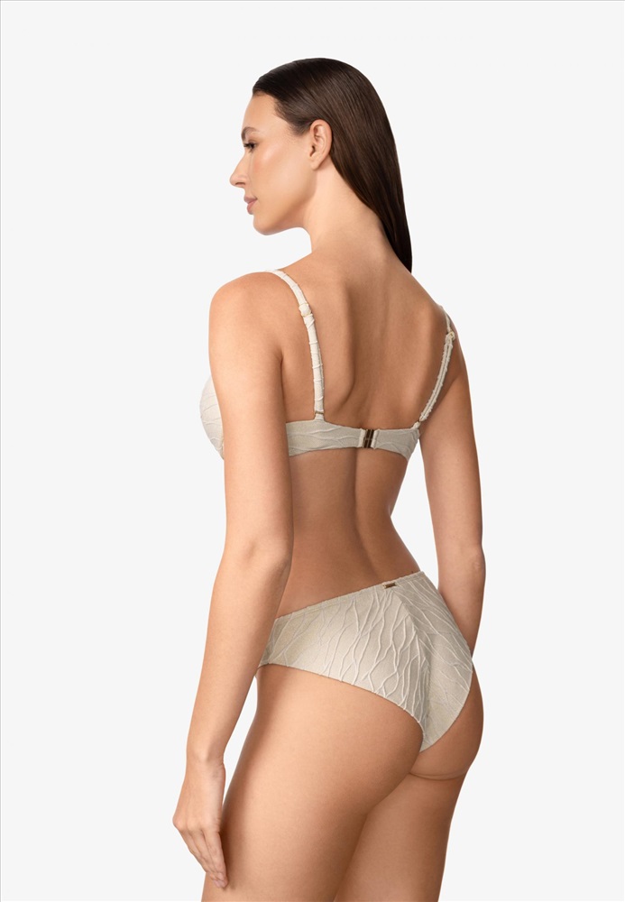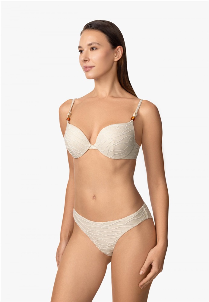 Формованная чашка со съемными корректорами «пуш-ап» на каркасной поддержке. На спине застежка. Регулируемые бретели декорированы аксессуарами.
