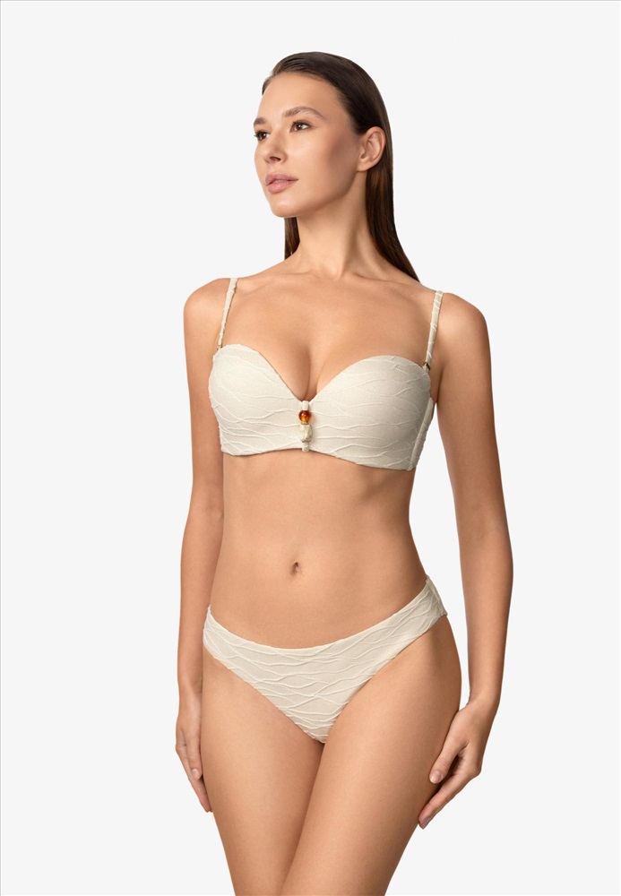 Бескаркасная чашка «бандо» со встроенным «пуш-ап». Эффект «скрытого каркаса». Уплотненный стан для комфортной и надежной поддержки. Внутри силиконовая лента по верхнему краю. По центру между чашек аксессуар. Регулируемые съемные бретели. На спине застежка.