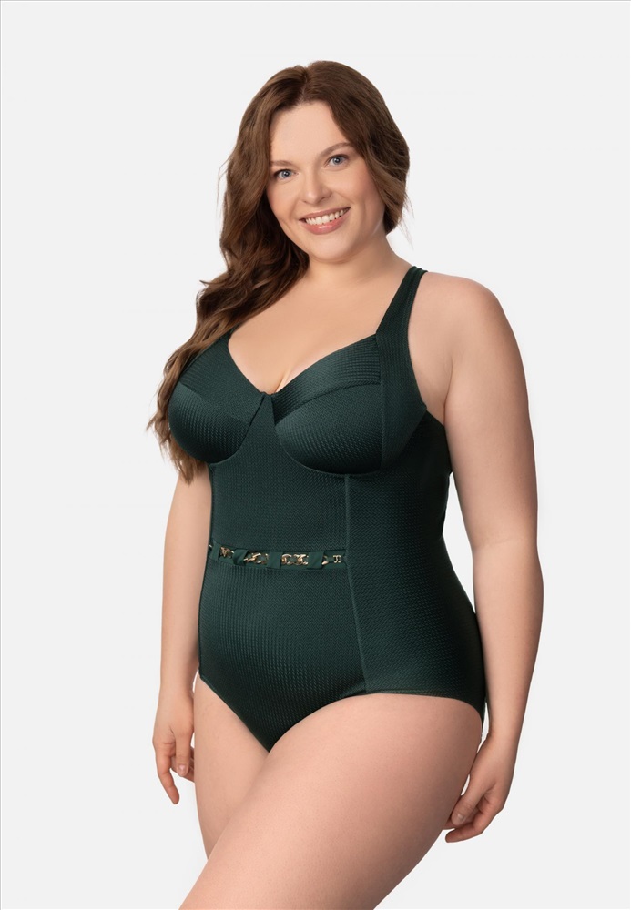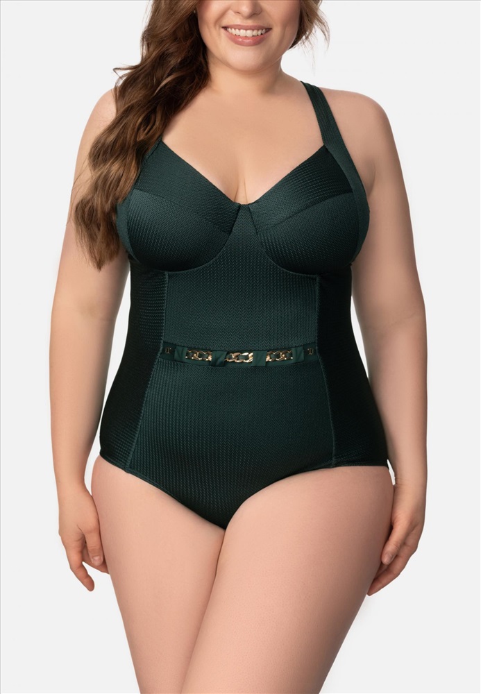 Купальник с мягкой чашкой на каркасной поддержке. Внутри чашка дублирована неэластичной сеткой для лучшей поддержки. Широкие регулируемые бретели фиксируются на спине. Спереди по линии талии вставка из атласа в тон основной ткани, со шлевками под декоративный съемный пояс-цепочку.