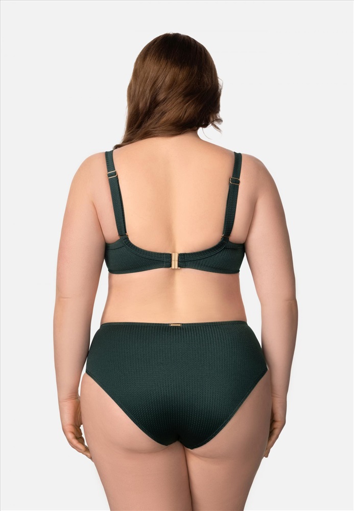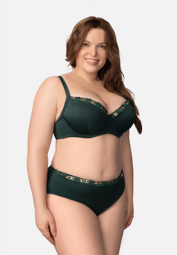 Формованная чашка на каркасной поддержке. Подойдет обладательницам пышных форм. Верх чашек украшен обтачкой из атласа в тон основной ткани с петлями под съемную декоративную цепочку. Регулируемые бретели фиксируются на спине. На спине застежка.