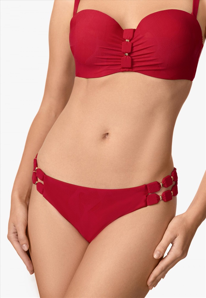 Брифы-бразилиана со средней линией талии. По бокам по две эластичные фигурные вставки с аксессуарами. Вертикальный шов на задней детали. Обработка задней детали в подворот с чистым краем.